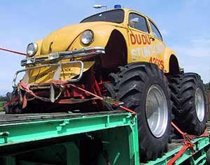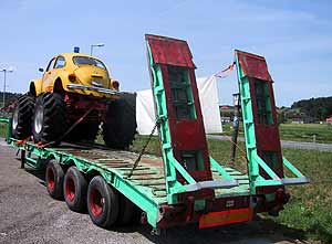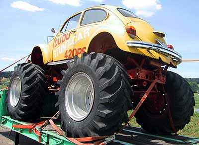 Richtung Feldbach und Seitenwind, daß mir das Eisen komische Sprünge macht. Da steht nahe Takern dieser Monster-Bug auf einem Trailer in der Gegend herum. Offensichtlich ein Show-Fahrzeug, mit dessen Unterfutter man gut auf die Äcker im Raabtal zur Arbeit fahren könnte.