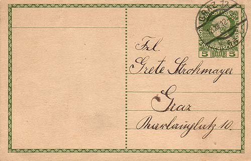 Stempel und Datum vom 12.12.1912, den eine Grete Strohmayer am Karlauerplatz 10 von einem