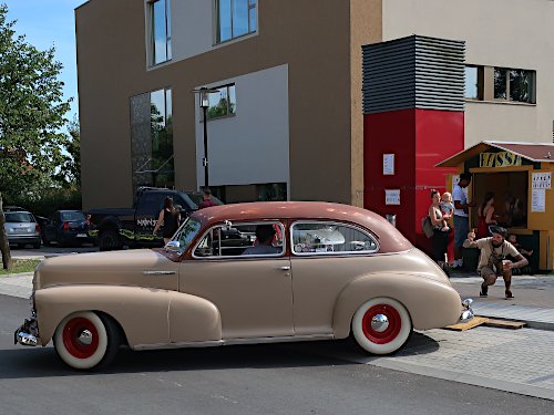 V8-Abteilung daher rollt; wie der Chevy (oben), der sachte über