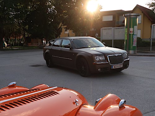 Kontraste: Roman Hold im Chrysler Magnum neben dem Morgan
