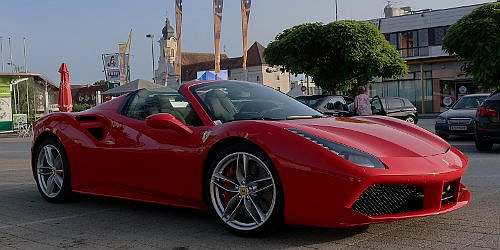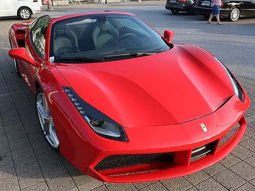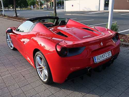 Ein Ferrari 488 Spider auf dem Supermarkt-Parkplatz in