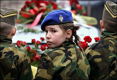 Serb girl Jelena Tmusic wears a Serbian uniform as she kisses the grave of former