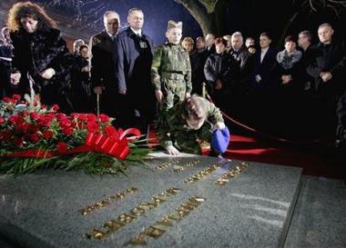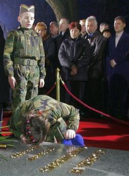 Child in military uniform kisses the grave of Slobodan Milosevic during